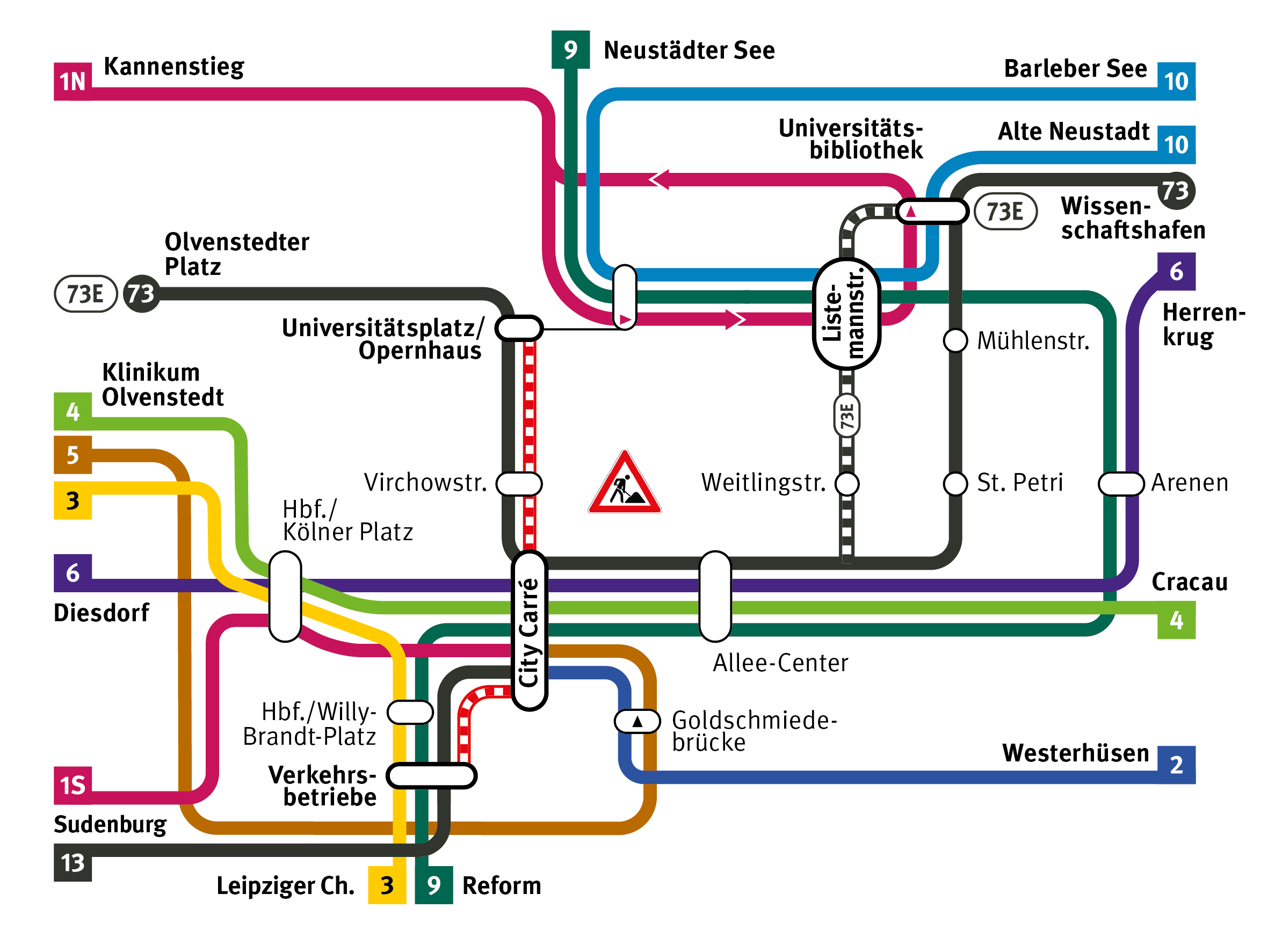 - Linie 73: Umleitung über Allee-Center, City Carré, Virchowstraße und Universitätsplatz / Opernhaus