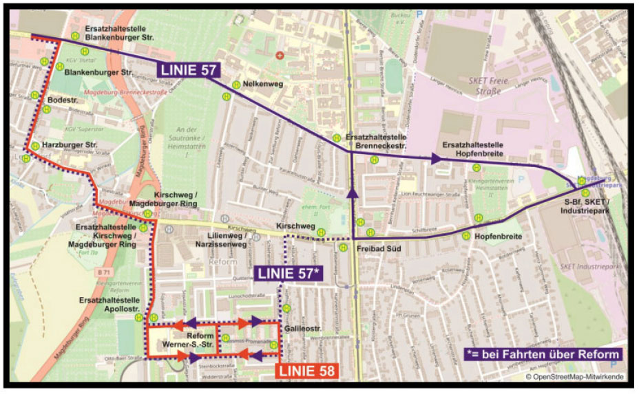 Die Buslinie fährt nicht über Lemsdorf, sondern über die Brenneckestraße und in Richtung Buckau weiter über die Salbker Straße. In Richtung Sudenburg kann die Buslinie 57 wie gewohnt über die Schilfbreite fahren, ab Freibad Süd aber weiter über die Brenneckestraße.