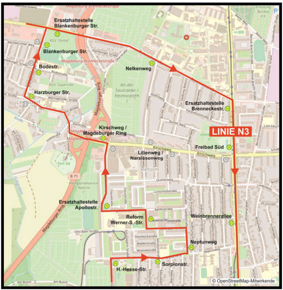 Die Nachtlinie N3 fährt eine Schleife nach Reform. Ab der Haltestelle Blankenburger Straße fahren die Busse vom Alten Markt kommend über die Brenneckestraße zum Freibad Süd und dann weiter planmäßig. Die Haltestellen in Lemsdorf werden somit erst auf dem Rückweg zum Alten Markt bedient.