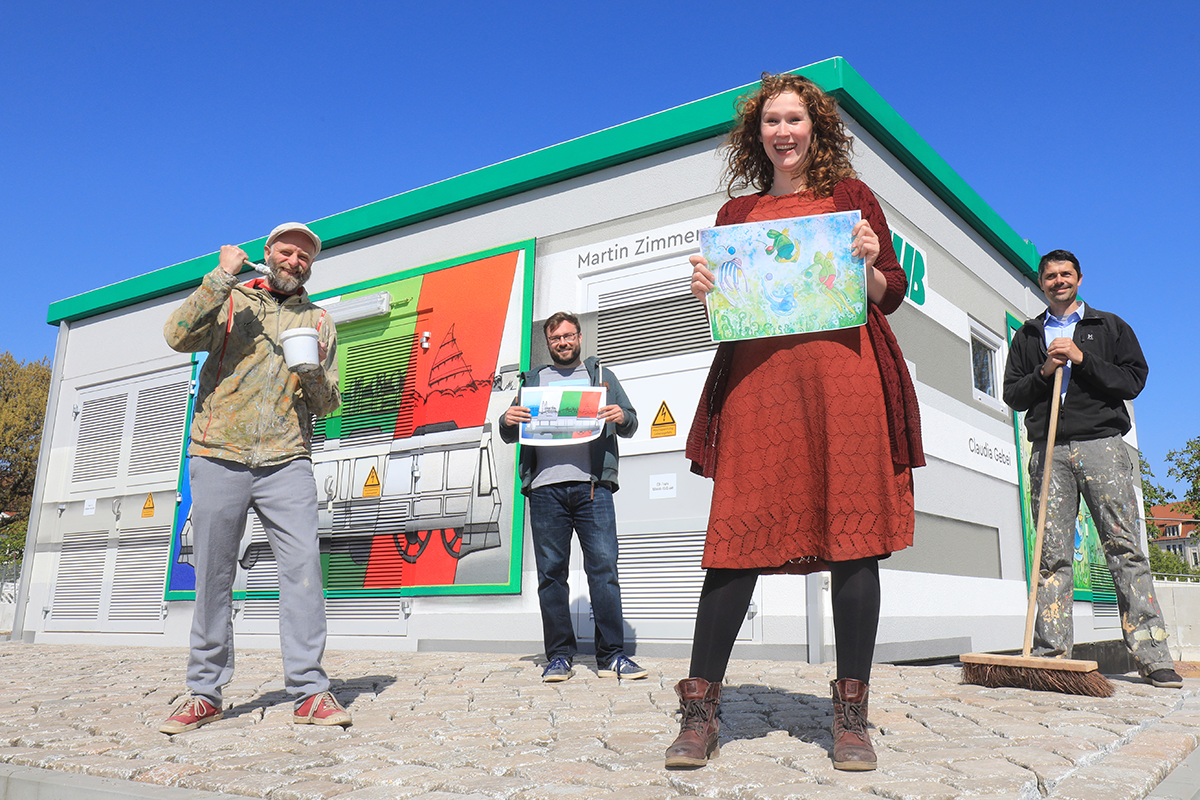 Wir haben in Brückfeld ein neues Gleichrichterunterwerk gebaut. Das wurde jetzt künstlerisch gestaltet. Die umgesetzten Motive wurden zuvor von Magdeburger Künstlern im Rahmen eines Wettbewerbs eingereicht.