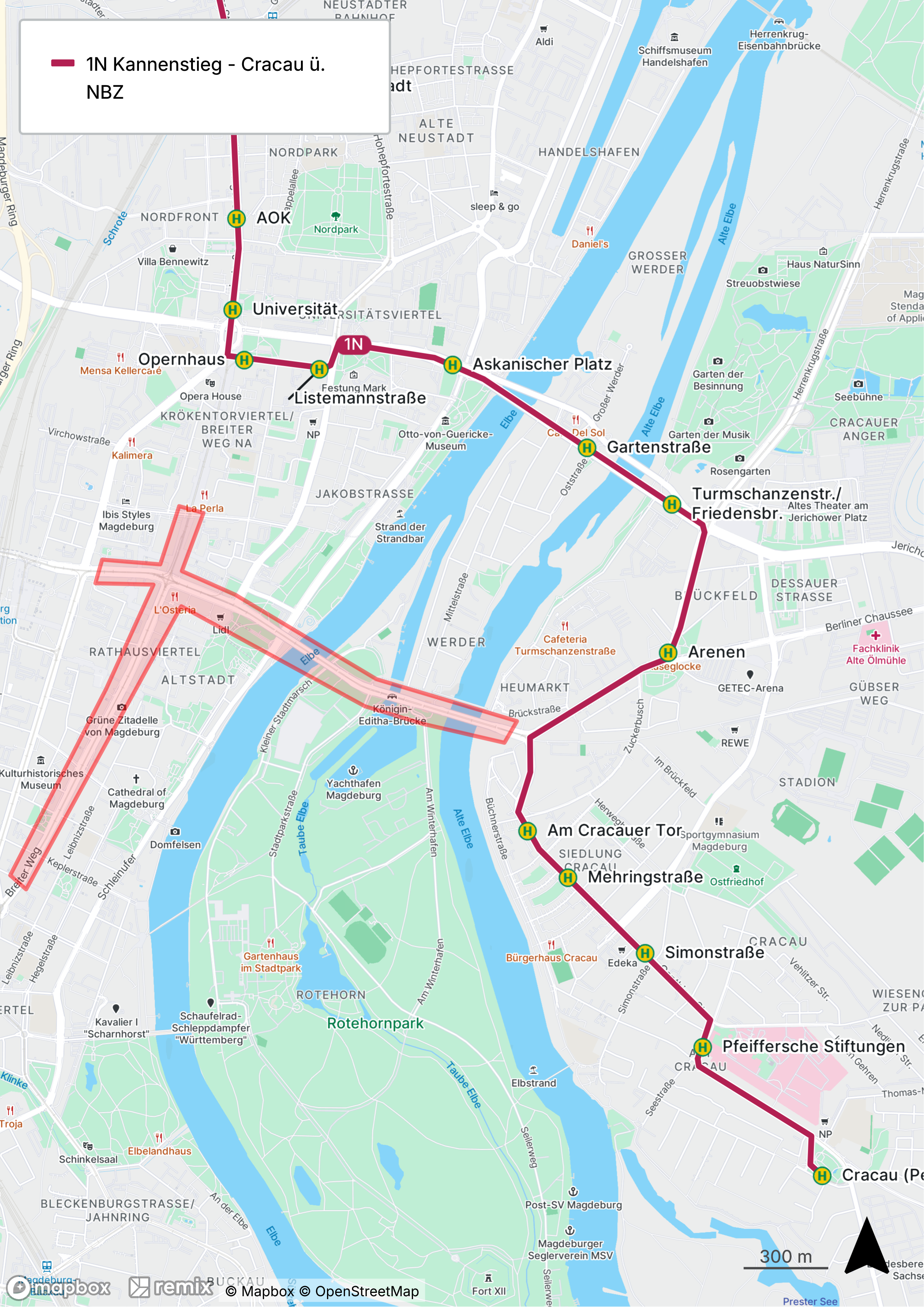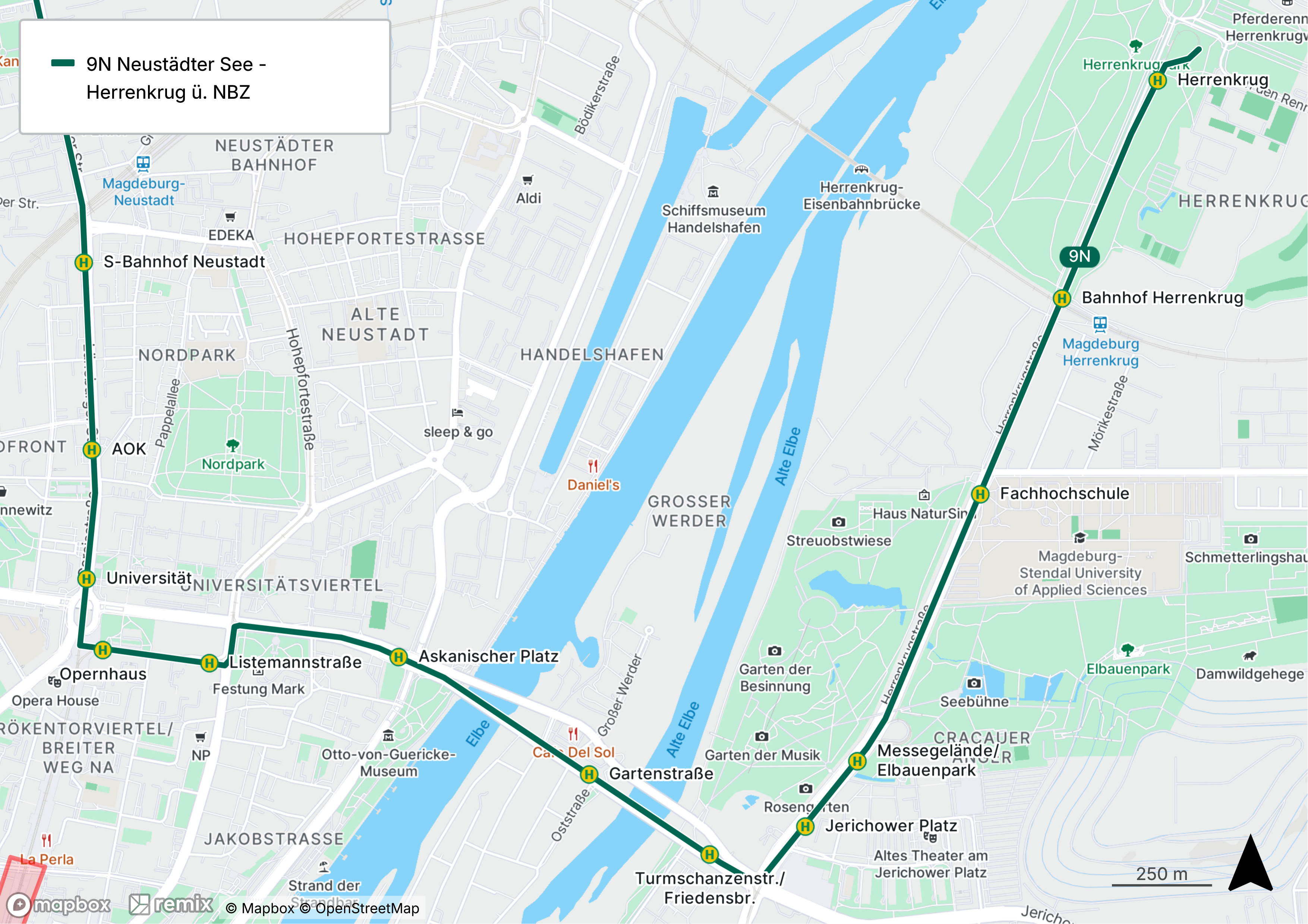 - 9N (Nord): Neustädter See – Herrenkrug über Listemannstr., Askanischer Platz