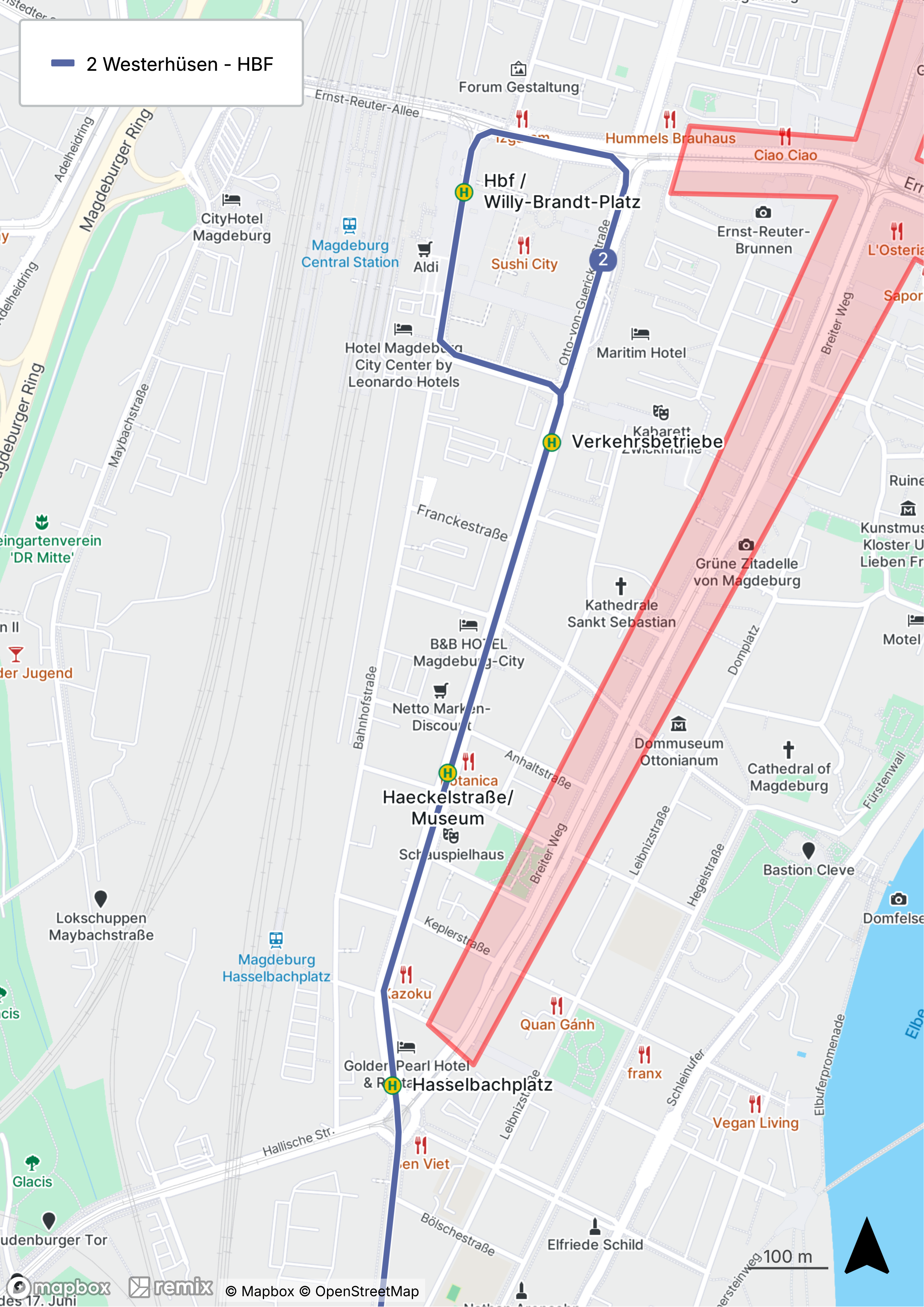 - Linie 2: Westerhüsen – Hauptbahnhof (über Verkehrsbetriebe)