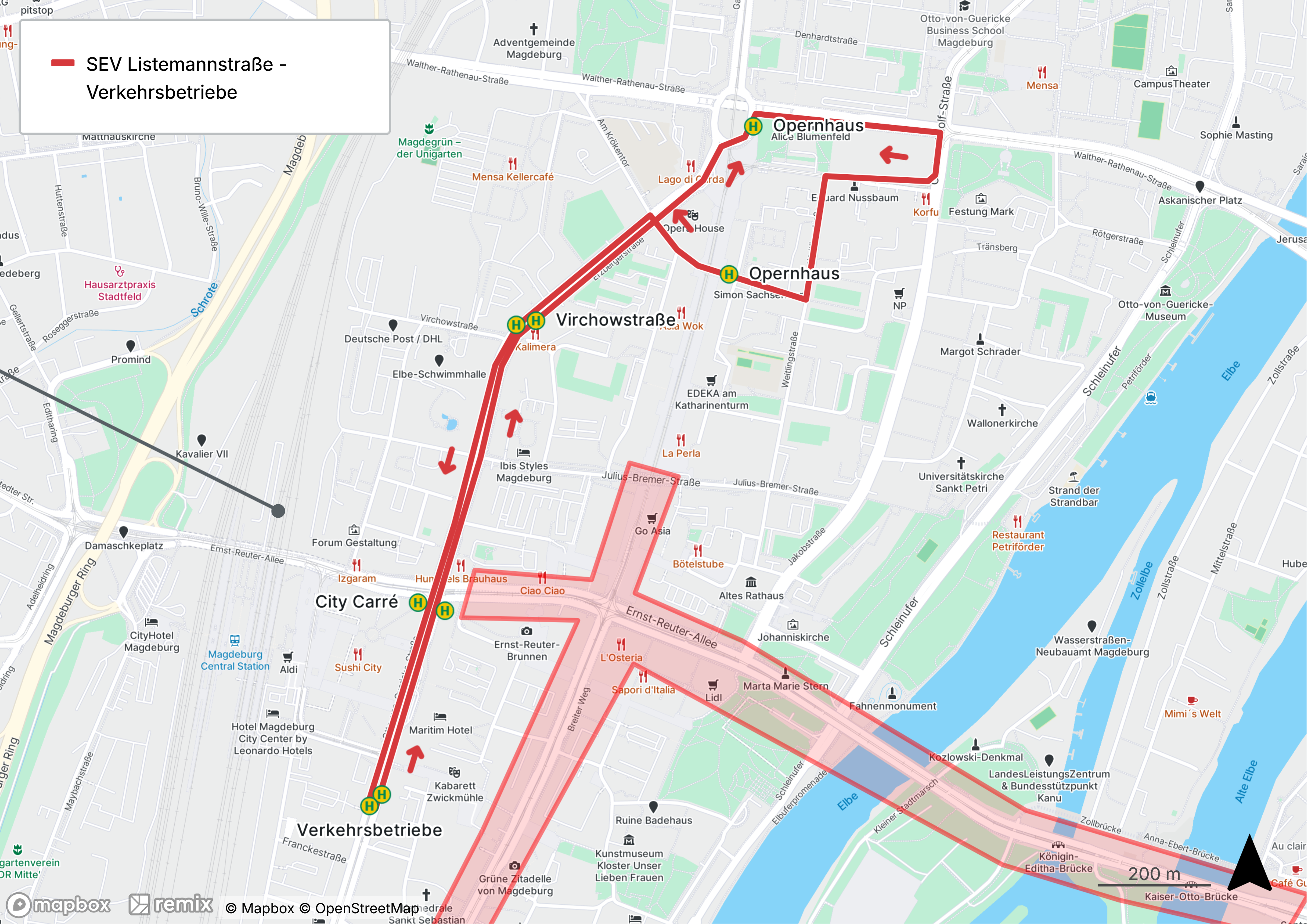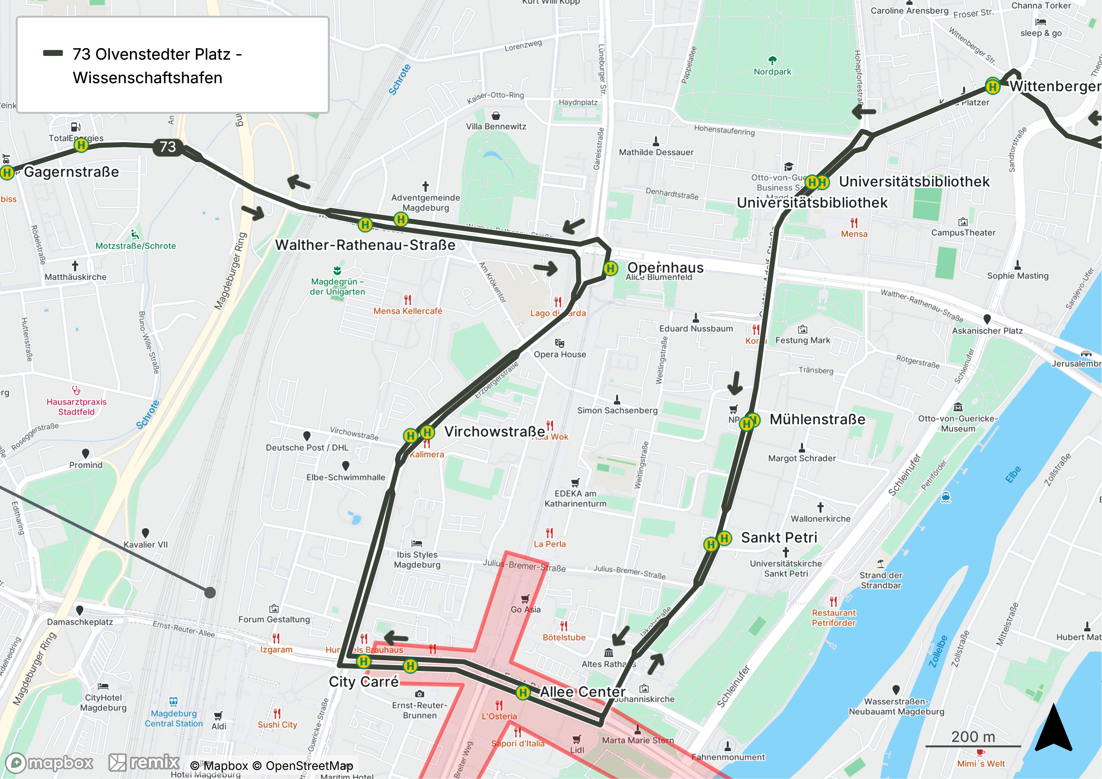 - Linie 73: Umleitung über Allee-Center, City Carré, Virchowstraße und Universitätsplatz / Opernhaus