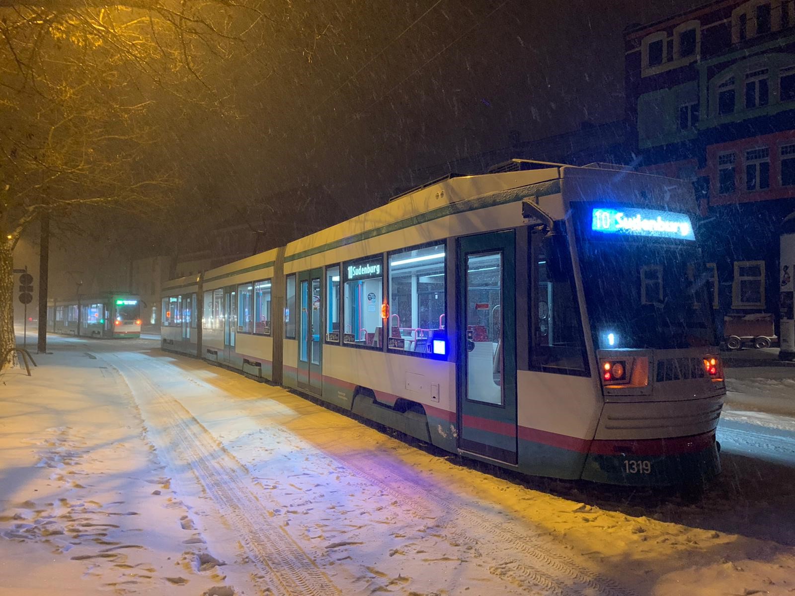 Der Abschnitt Hauptbahnhof <> Olvenstedter Platz konnte dank Unterstützung von Mitarbeitenden des Ordnungsamtes in Betrieb genommen werden. Die Beamtinnen und Beamten halfen dabei, falschparkende Fahrzeuge zu entfernen, damit ein Einsatz von Schneepflügen zur Beräumung der Strecke möglich wurde.